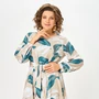 Платье из струящейся вискозной ткани , Х-образного силуэта с полуприлегающим лифом. Платье отрезное по линии талии. По переду лифа расположены рельефы, по спинке лифа талиевые выточки. Юбка расклешенная из шести клиньев со встречными складками по линии талии. В среднем шве спинки предусмотрена молния. Рукав втачной длиной ¾, по низу манжета с эластичной вставкой .