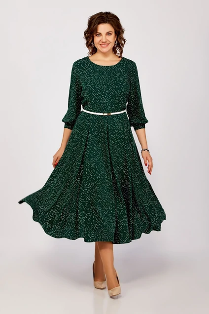 Платье из струящейся вискозной ткани, Х-образного силуэта с полуприлегающим лифом. Платье отрезное по линии талии. По переду лифа расположены рельефы, по спинке лифа талиевые вытачки. Юбка расклешенная из шести клиньев со встречными складками по линии талии. В среднем шве спинки предусмотрена молния. Рукав втачной длиной ¾, по низу манжета с эластичной вставкой .