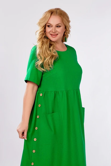 Платье из вискозно-льняной ткани прямого силуэта длиной миди. Платье с отрезной, слегка завышенной линией талии и сборкой по юбке.