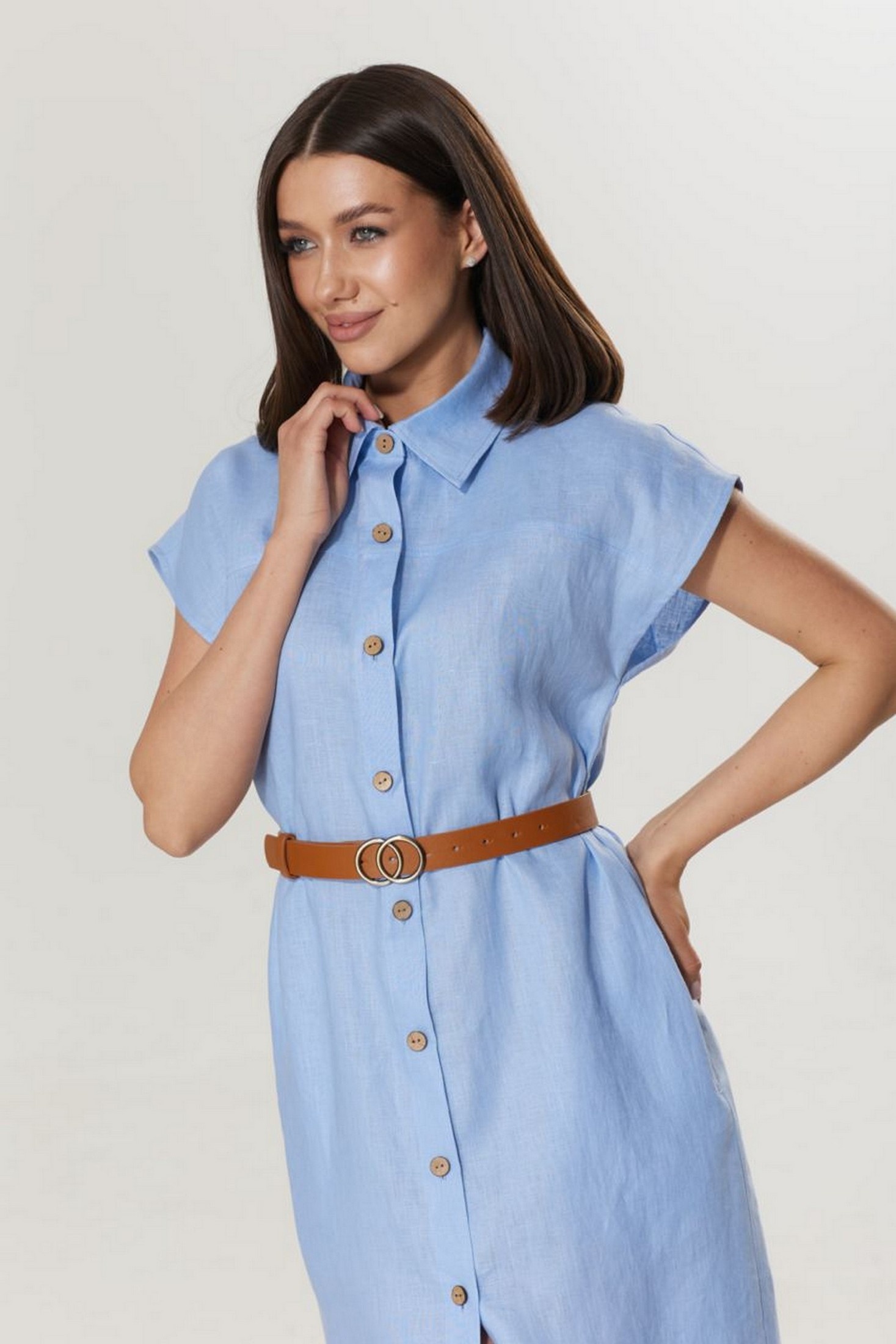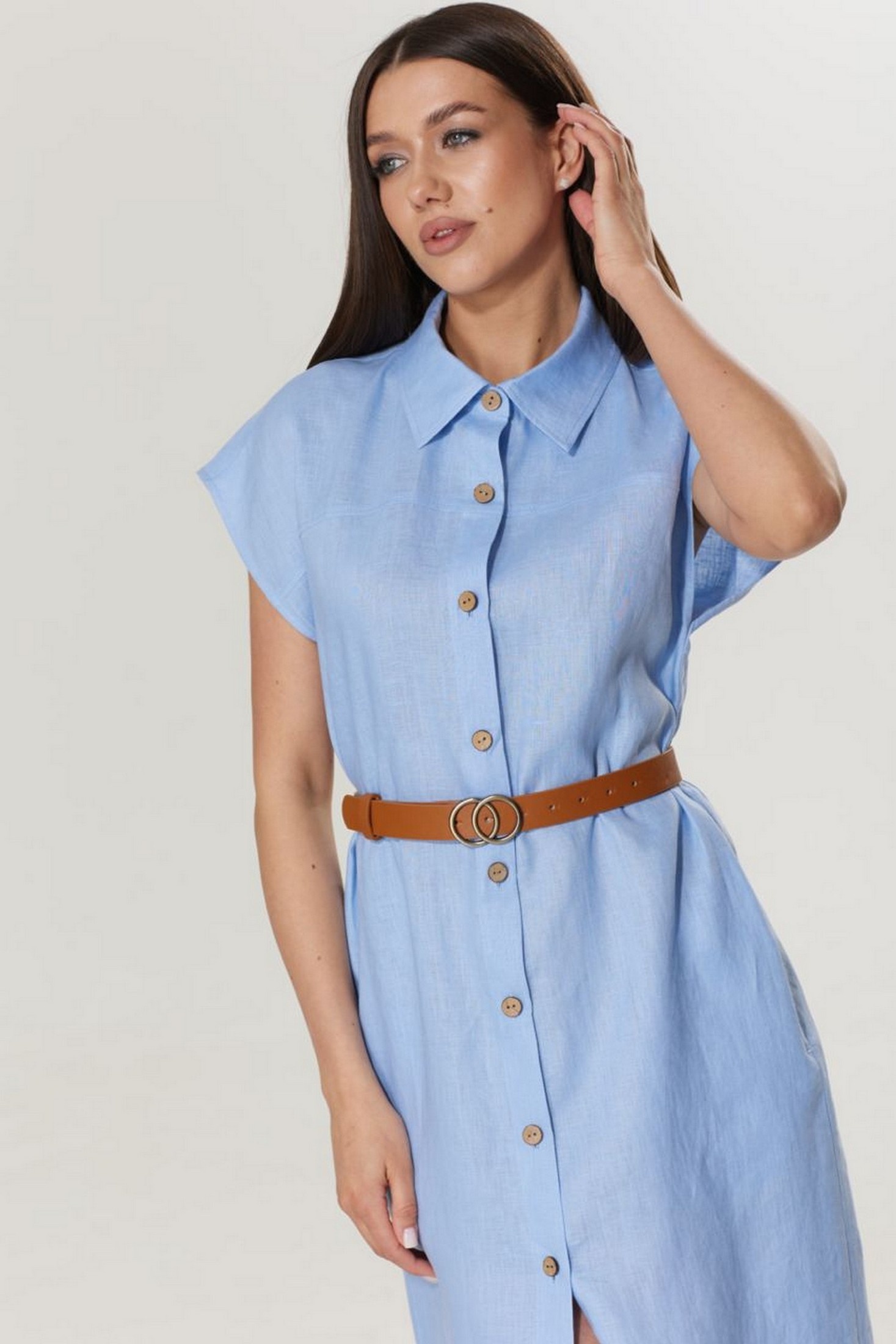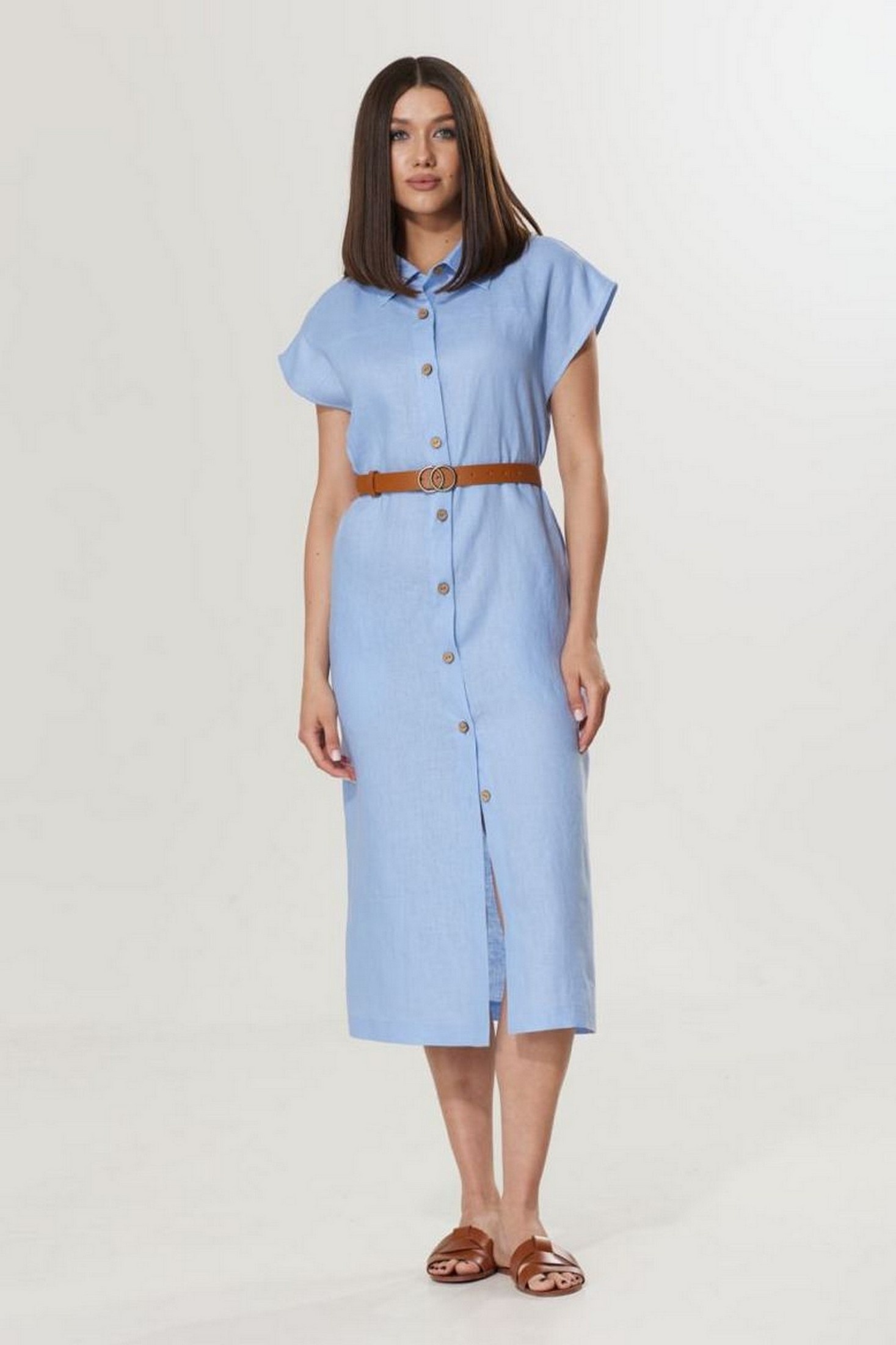 Платье 221 T.N.D привнесет свежесть и легкость в ваш гардероб. Коллекция бренда T.N.D предлагает стильное летнее платье-рубашку из 100% льна, обеспечивающего комфорт и прохладу в жаркие дни. Прямой силуэт с округлой горловиной и рубашечным воротником придает элегантность, а спущенная линия плеч и функциональные карманы добавляют удобство. Центральная застежка на петли и пуговицы сочетается с поясом в комплекте, создавая универсальный образ. Идеально для летнего сезона и подходит как для повседневных выходов, так и для работы. Стильное голубое платье средней длины станет отличным дополнением к вашему образу.