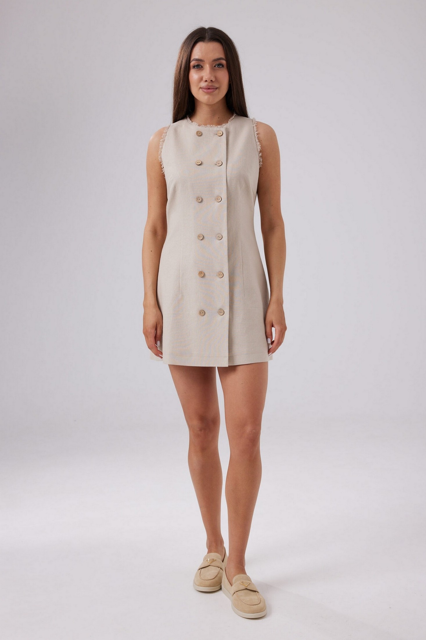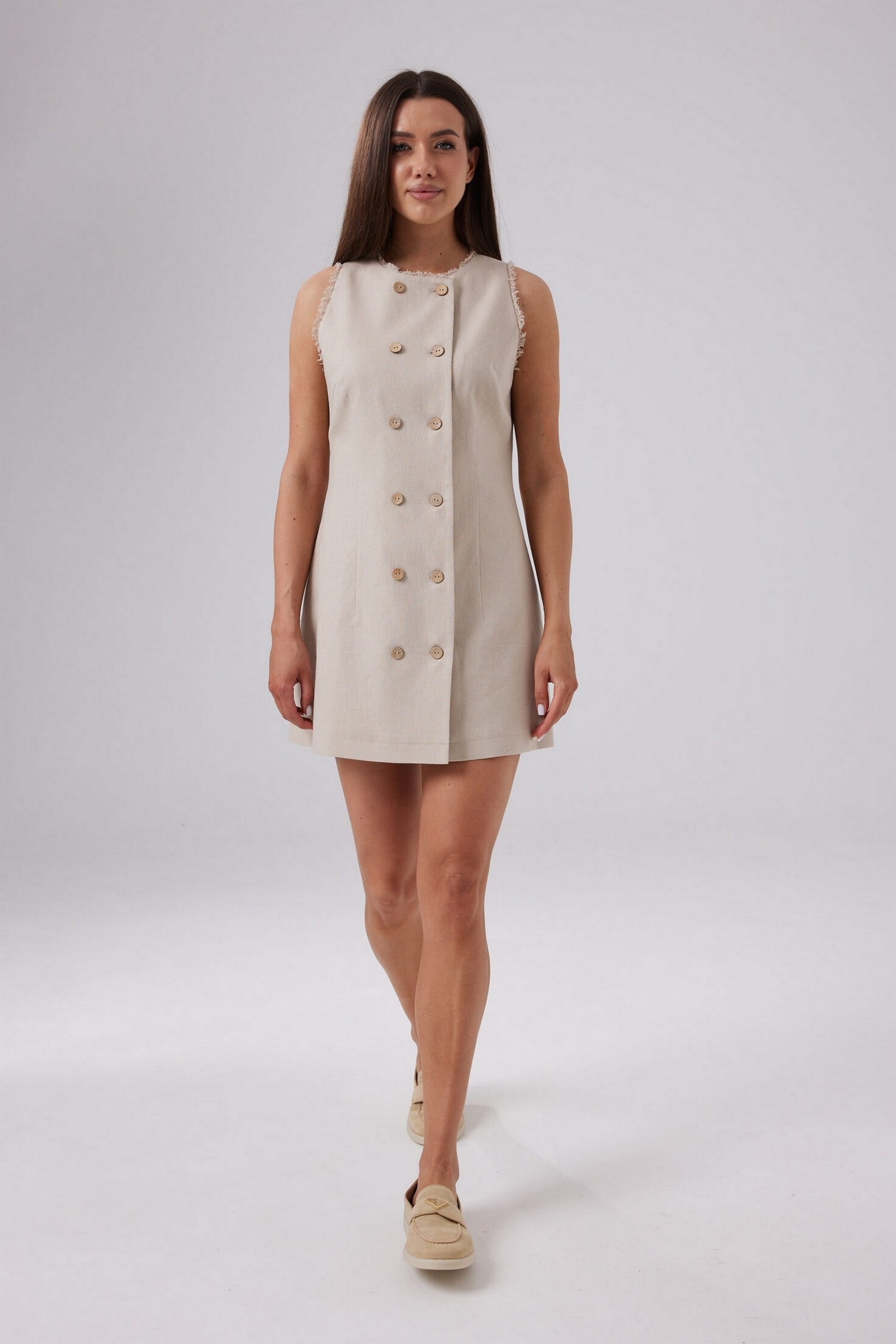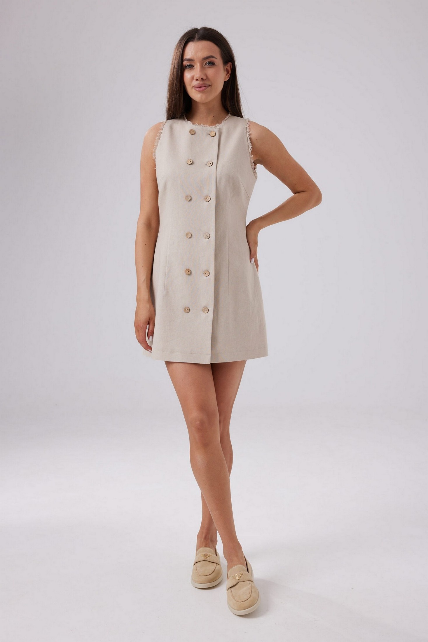 Платье 235 T.N.D — идеальный выбор для летнего сезона. Коллекция бренда T.N.D предлагает лёгкое женское платье, выполненное из льняной ткани с добавлением вискозы, что обеспечивает комфорт и воздухопроницаемость. Полуприлегающий силуэт и длина мини создают современный и стильный образ, подходящий для повседневной носки и отдыха. Центральная застежка на пуговицах придает платью оригинальность, а декоративно вытрепанные края горловины и пройм добавляют изюминку. Платье дополнено хлопковой подкладкой для максимального комфорта. Нежный бежевый оттенок позволяет легко сочетать его с другими элементами гардероба, делая этот наряд универсальным решением для летнего гардероба.