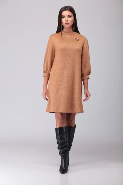 Платье женское, А-образного силуэта. Рукав втачной, длиной 3/4 фантазийной формы. Сверху рукав со сборкой. Снизу притачная манжета и мягкие складки. Вырез горловины круглой формы. Декором служит съемная брошь. Платье на трикотажной подкладке. Спинка без особенностей.