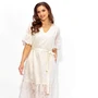 Платье женское полуприлегающего силуэта, расклешенное к низу. По переду наклонные вытачки и рельефы. По спинке талевые вытачки, подрез чуть ниже линии талии и кокетка овальной формы с разрезом и отделочной нашивкой по горловине. Горловина круглой формы. Рукав втачной, длинной 3/4 со сборкой сверху. Низ рукава присобран на манжету. Рукава и кокетка спинки выполнены из отделочной ткани(прозрачная органза с рисунком)