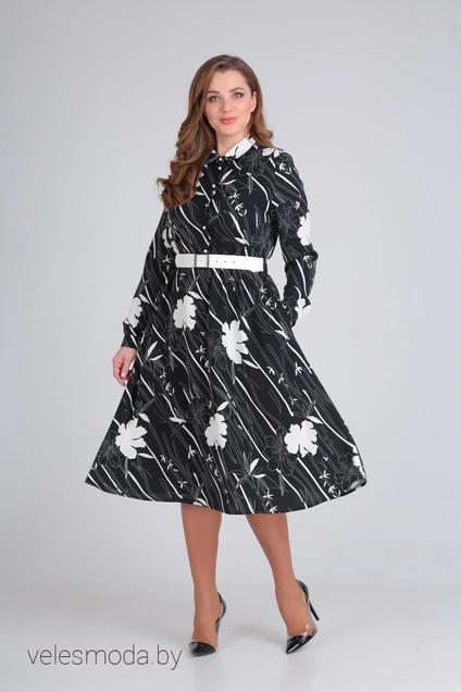 Платье из контрастной ткани с цветочным принтом, по линии талии отрезное и присборено на резинку, расширенное к низу. Лиф с центральной бортовой застежкой на петли и пуговицы. В боковых швах юбки расположены карманы. Рукав втачной одношовный, с притачной манжетой с застежкой на пуговицу. Вырез горловины круглый с воротником на стойке рубашечного типа. По линии талии платье перехвачено декоративным поясом из искусственной кожи.