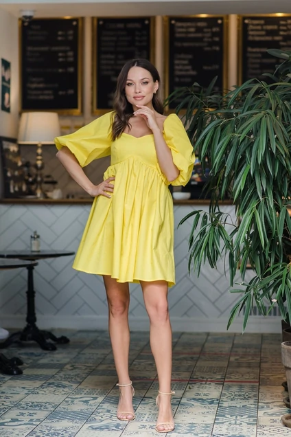 Платье с фигурным подрезом по талии, талия завышенная, верхняя часть платья двойная с фигурным вырезом. Центральная верхняя часть спинки присборена эластичной тесьмой. Рукав фонарик двойной, объемный, окат и низ рукава присборен эластичной тесьмой. Дл платья 88 см, дл рукава 39 см