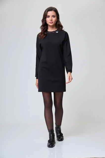 Платье из трикотажного полотна прямого силуэта зауженное к низу. По горловине неплотно облегающая шейку стойка из декоративной трикотажной тесьмы. Рукав длинный цельнокроеный, собран на манжетку. Платье без подкладки. Декоративная стильная брошь украшает платье.