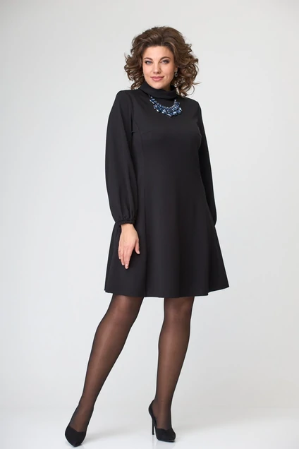 Универсальное платье из трикотажного полотна. Полуприлегающее по талии и расширенное к низу. Застежка молния по спинке. Воротник «мягкая стойка». Рукав длинный присобран на эластичную тесьму. Платье без подкладки. Украшение дополняет платье.