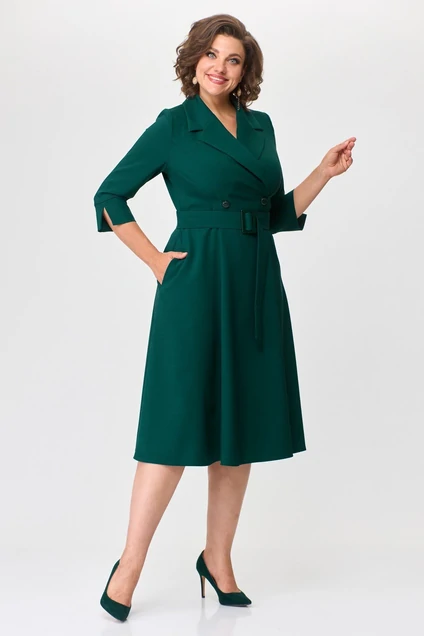 Элегантное женственное платье из костюмной ткани с декоративной пряжкой и пуговицами в тон ткани. Платье отрезное по талии, полуприлегающего силуэта. Лиф полуприталенный с глубоким запахом и воротником. Юбка из клиньев, с карманами в боковых швах. Рукав втачной с манжетой, длина 3/4. По спинке застежка «молния». Пояс съемный с пряжкой. Платье без подкладки.