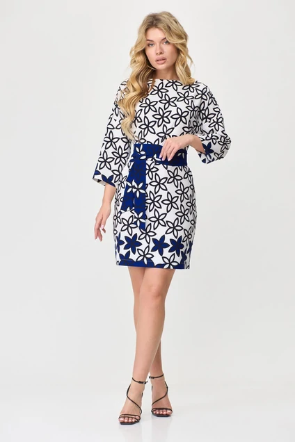 Платье из плотной непрозрачной принтованной ткани. Горловина овальная. Силуэт свободный, зауженное к низу. Плечо спущено. Рукав 3/4. Пояс съемный.