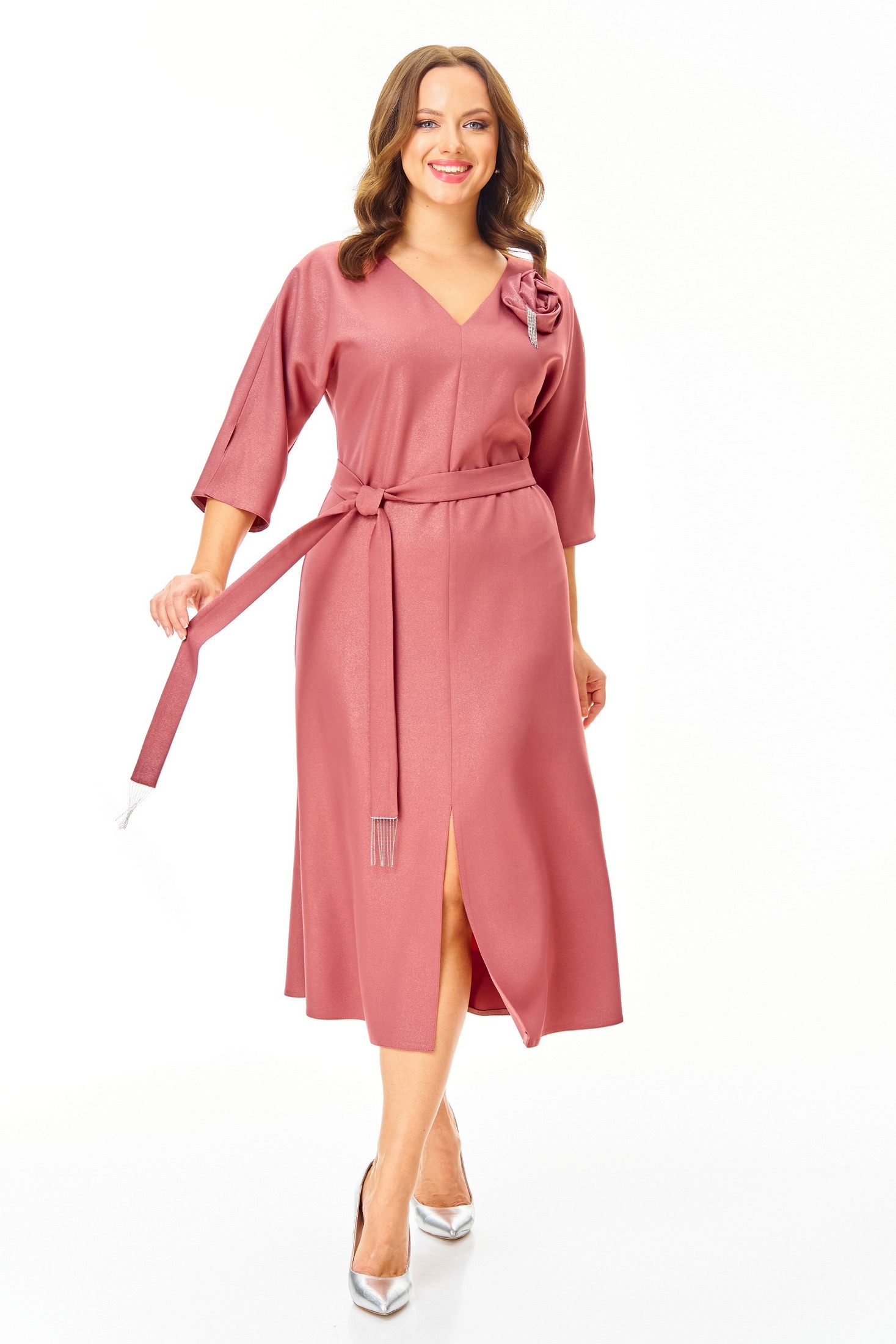 Платье 7711 Tender and nice — идеальный выбор для стильного выхода. Коллекция бренда Tender and nice предлагает нарядное платье из плотной ткани с легким блеском, подчеркивающее вашу элегантность. Фасон полуприлегающий с небольшим расклешением и съемным поясом, что придает образу затейливую легкость. V-образный вырез и цельнокроеные рукава с разрезом добавляют женственности. Платье украшено съемным цветком и молнией на спине. Основной цвет — пудровый, подчеркивающий утонченность. Длина изделия составляет 115 см, рукава — 43 см, что делает его подходящим для праздничных мероприятий. Сочетание вискозы, полиэстера и эластана обеспечивает комфорт и легкость в носке.