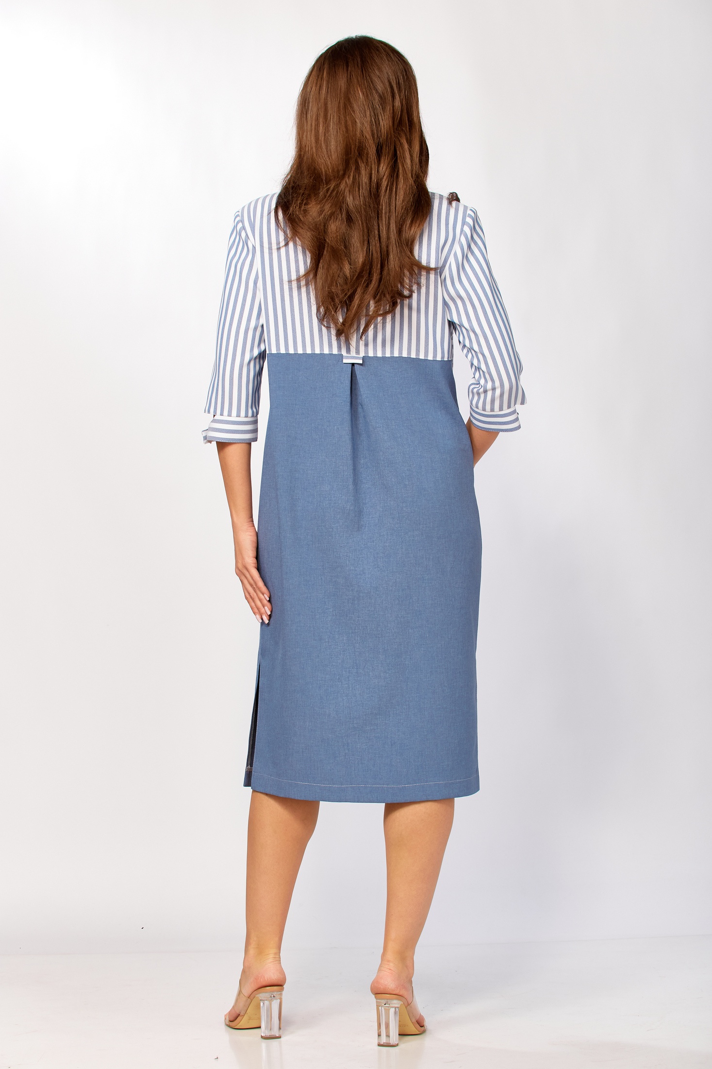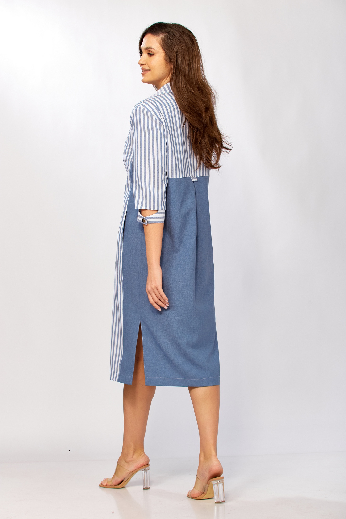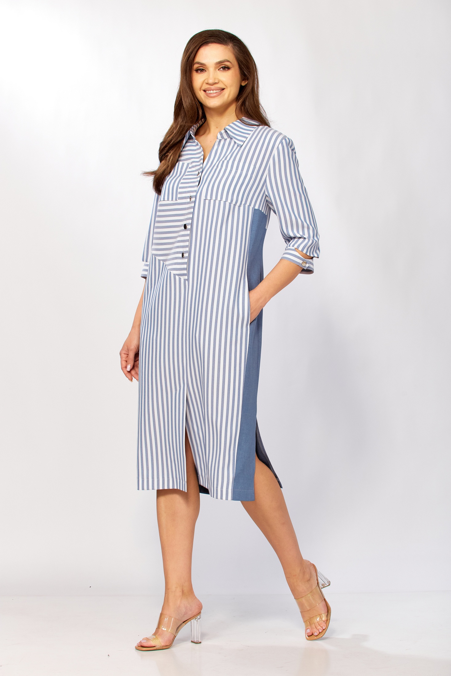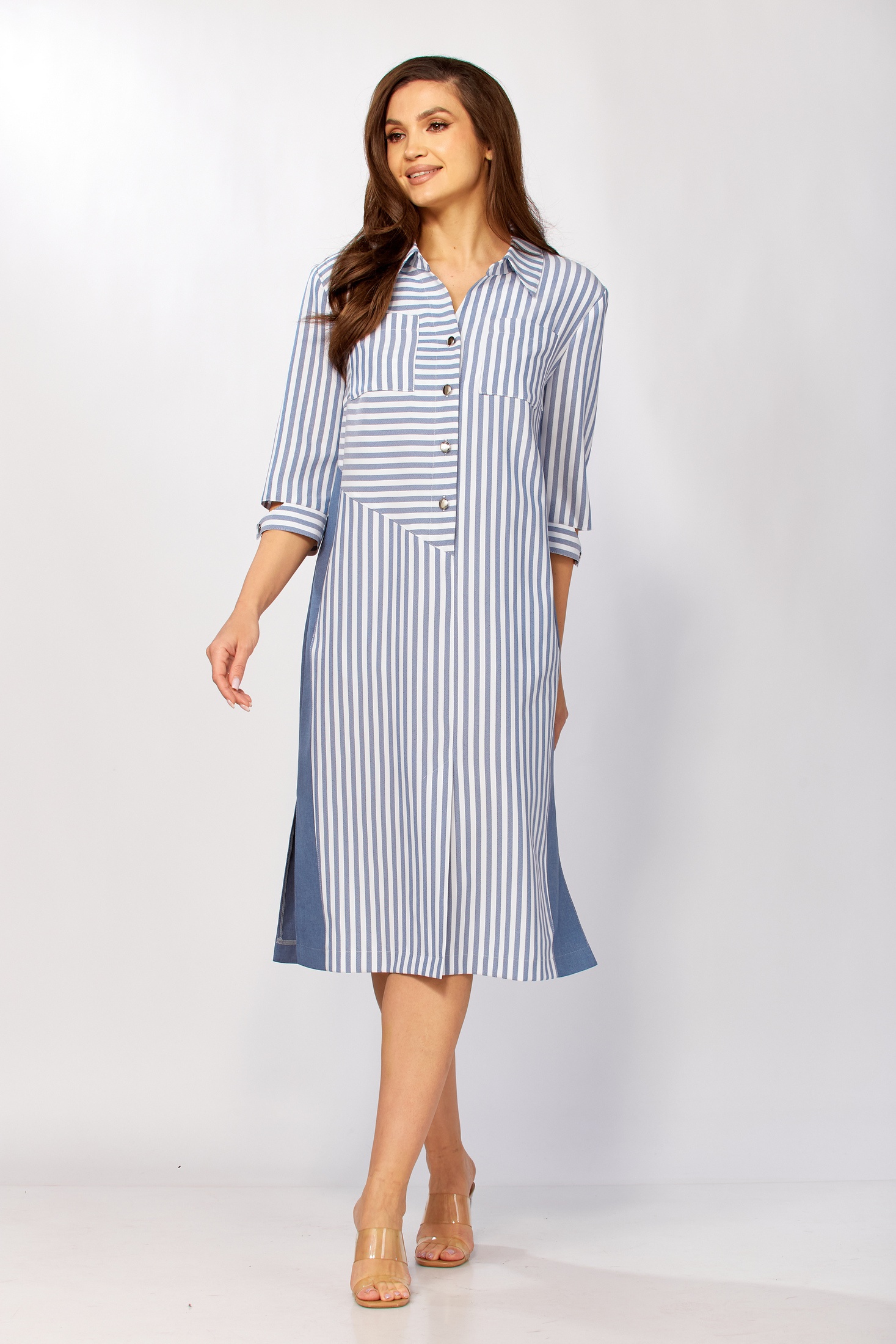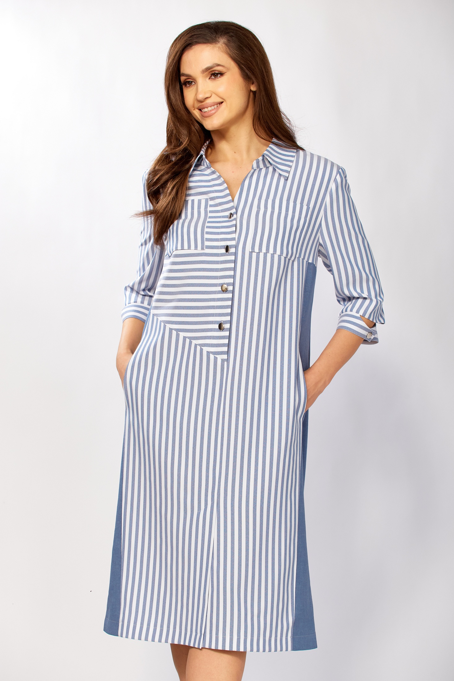Платье 411 Tensi от коллекции бренда Tensi демонстрирует прямой силуэт, который подчеркивает фигуру благодаря продуманным линиям кроя. Сочетание полоски и однотона добавляет графичности, а гармония вискозы и полиэстера обеспечивает комфорт и износостойкость. Асимметричный перед с нагрудными вытачками, центральной застёжкой на пуговицах и двумя типами карманов делает это платье идеальным для офиса. Длина от центра горловины до низа составляет 108 см, а удобные рукава 3/4 с манжетой на пуговице подчеркивают стильность образа. Платье выполнено в приятной цветовой палитре и подходит для весеннего и осеннего сезонов.