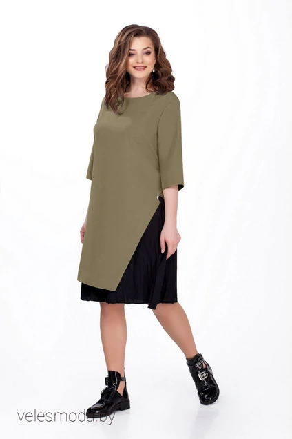 Платье прямого силуэта. По спинке обработана застежка с металлической молнией. Перед с нагрудными косыми вытачками из боковых швов. Рукав прямой со спущенной проймой. Платье двухслойное. Нижняя юбка выполнена из контрастной ткани. Низ рукава и юбки обработан отделочной тканью. Длина – 99 см.