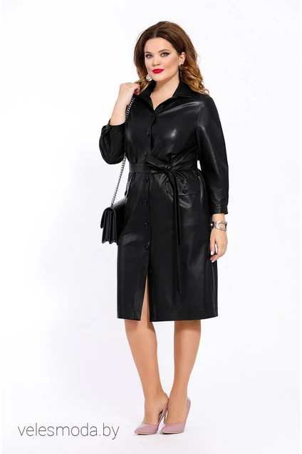 Модное кожаное платье-рубашка прямого силуэта. Рукав втачной длиной 5/6 на манжете. Рубашечный воротник, накладные карманы по бедрам, застежка до низа на пуговицы, по спинке небольшая кокетка.