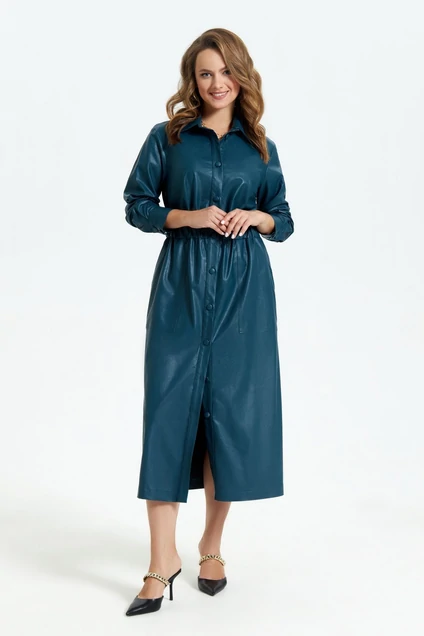Платье-рубашка полуприлегающего силуэта из эко-кожи. Втачной длинный рукав на манжете, рубашечный воротник, застежка на пуговицы. Талия на широкой резинке, съемный пояс. Накладные карманы, по спинке небольшая кокетка.