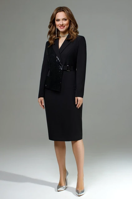 Платье полуприлегающего силуэта из костюмной ткани с отделкой из пайеток. Пиджачный воротник, иммитация жакета сверху, клапан справа. Рукав втачной длинный с потайной молнией в заднем шве. Застежка на потайную пуговицу и пряжку по переду. Без подкладки.