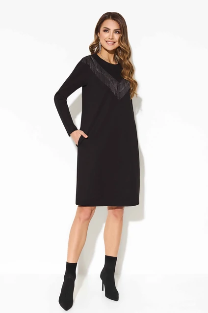 Платье из плотного трикотажа с декоративной бахромой. Прямой силуэт, карманы в боковых швах, круглый вырез горловины. Рукав длинный покроя реглан. Застежка на одну пуговицу по спинке, без подкладки.