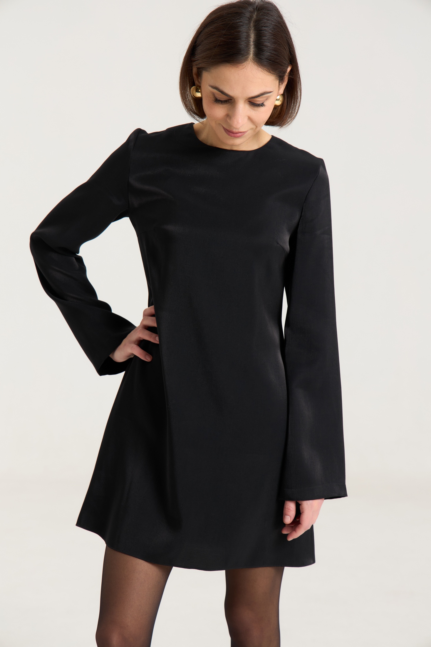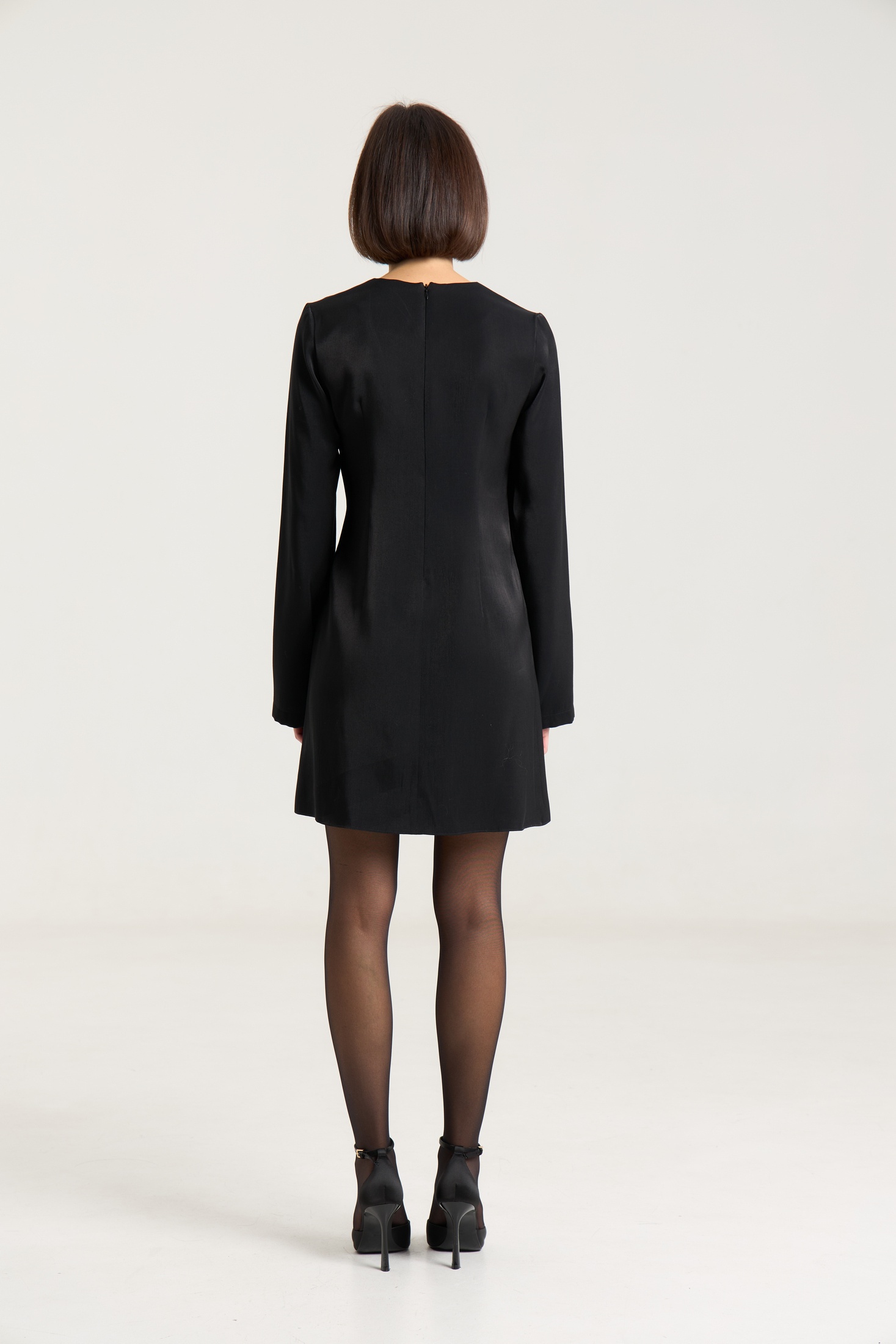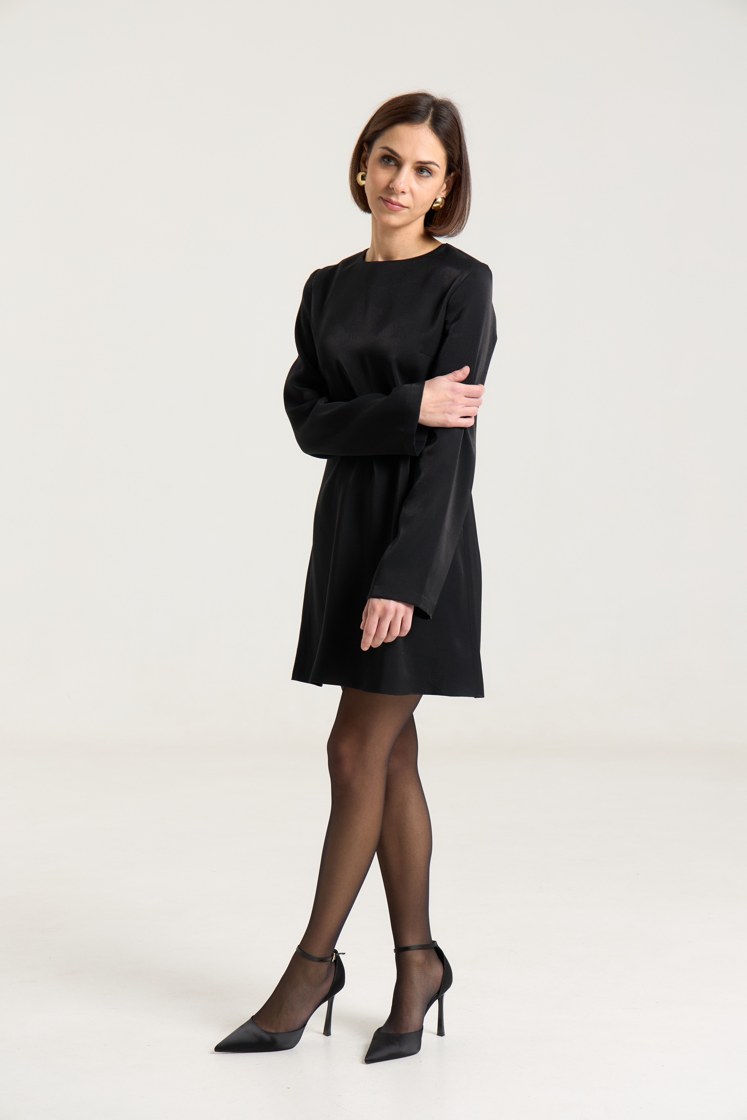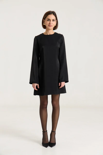 Платье полуприлегающего силуэта, расклешнное к низу, рукав свободный, втачной. По груди нагрудные выточки, по спинке талиевые выточки, застежка на потайную молнию в среднем шве. Платье выполнено излегкой вискозной ткани в черном цвете, ткань имеет красивый серебряный блеск и выглядит дорого.Платье без подкладки. Длина по спинке 85 см, полуобхват груди - 44 см, длина рукава - 63 см, длина плеча - 11 см в 42-м размере. Рост модели на фото 168 см.