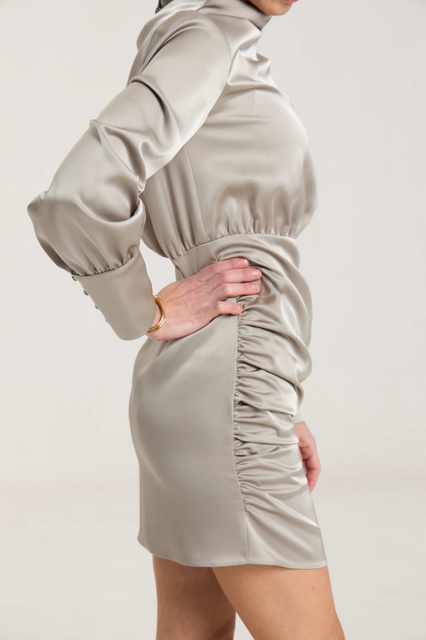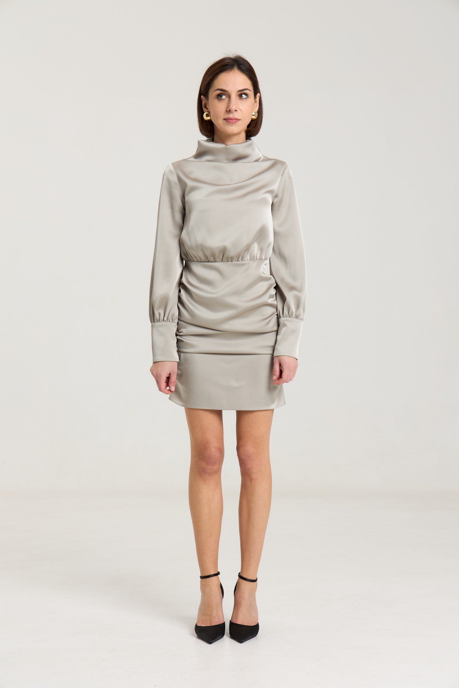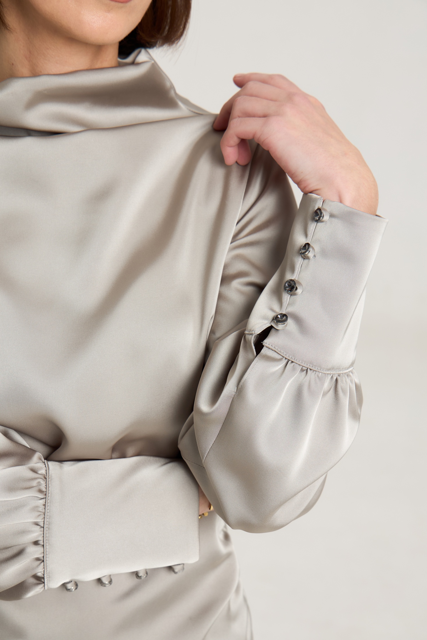 Платье с драпировкой, талия отрезная, прилегающего силуэта, рукав втачной, с высокой манжетой с застежкой на петли-пуговицы. Воротник цельнокроеный, стойка, в боковом шве застедка на молнию, на горловине застежка на петли-пуговицы. Платье без подклажки, выполнено из плотнойй атласной ткани красиво подчеркивает фигуру. Длина рукава 62 см, длина по спинке 80 см, полуобхват груди - 43 см, высота манжеты - 12 см в 42-м размере. Рост модели 168 см.