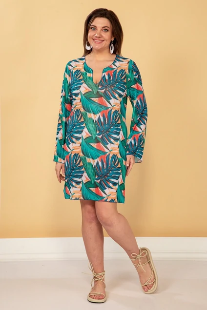Укороченное. Пляжное платье с длиной выше колена с втачными рукавами 7\8. Длина изделия 87 см, длина рукава - 59 см.