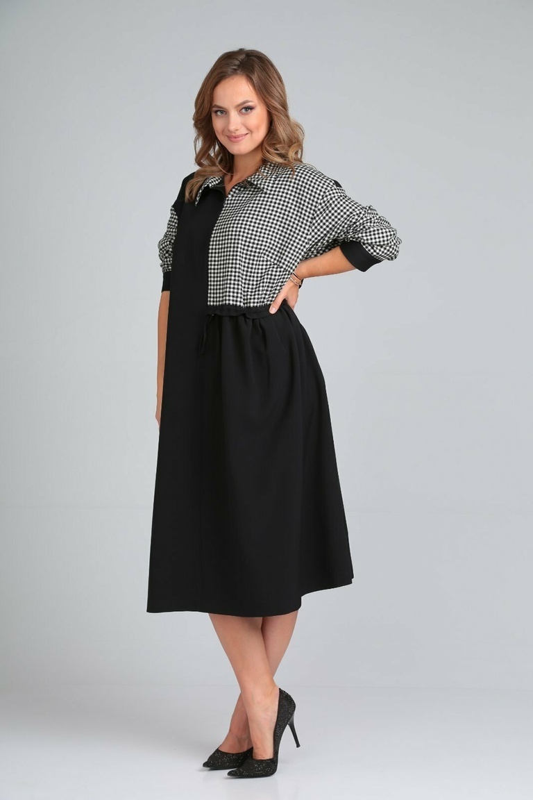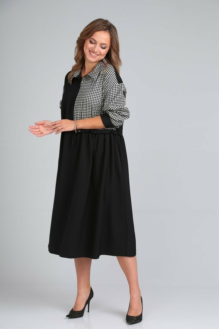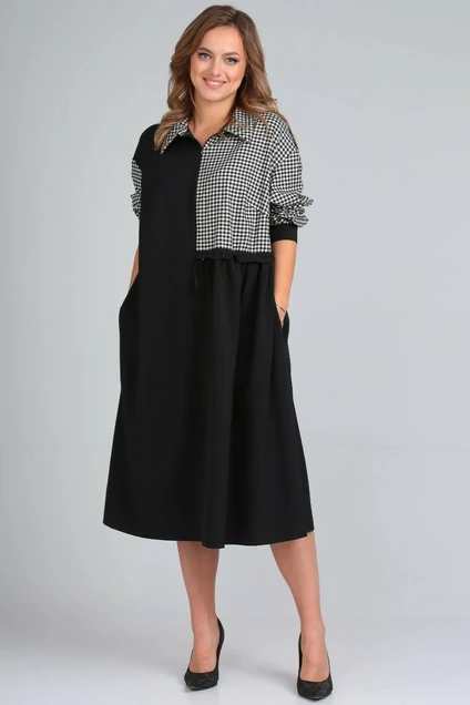 Платье свободного силуэта в стиле «бохо», выполнено из двух тканей-компаньонов. Воротник отложной, застежка - центральная потайная молния до линии талии. Перед платья ассиметричный - правая половинка цельнокроеная, левая - отрезная по линии талии, нижня часть лифа с кулисой и фиксатором. Линия плеча спущена, рукав рубашечный на манжете с пуговицей. Спинка ассиметрична, со средним швом: правая часть цельнокроеная, левая-отрезная по линии талии. В боковых швах потайные карманы.