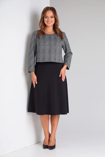 Платье женское прилегающего силуэта, имитация комплекта из 2 видов трикотажного полотна (с рисунком и однотон). Верхняя часть отлетная, по спинке застёжка на петли-пуговицы. Нижняя часть расклешённая, в боковых - карманы и потайная молния. Вырез горловины округлой формы. Рукав 7/8 с манжетой.