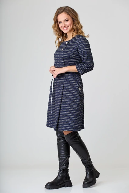 Отрезное по линии талии. В боковых швах клапаны закреплены декоративной пуговицей. Особую стильность и завершенность образу придают детали, в виде декоративных пуговиц по переду платья и гармонично подобранного пояса!