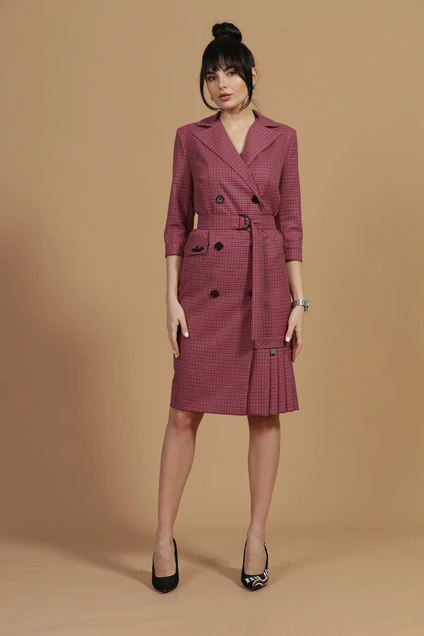 Элегантное двухбортное платье который сезон будоражит умы дизайнеров .Яркое и женственное платье идеально подходит как для офисных луков ,так и для вечера в ресторане.Украшение платья служат складочки по нижней полочки платья. Длина 95 см