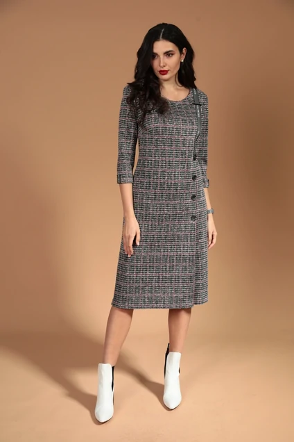 Платье женское А-силуэта.Рукав однощовный 3\4 с манжетом.Горловина округлой формы ,в боковых швах расположены карманы.По сптнки в боковых швах расположены декоротивный пояс из тесьмы ,съемный.длина платья -106 смДлина рукава -45 см