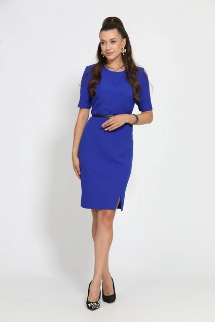 Элегантное платье - футляр с ремнем слегка зауженное к низу.На пережде в левой части расположен подрез идущий из бокового шва переходящий в разрез .В таком платье вы всегда будете выглядеть стильно и элегантно.