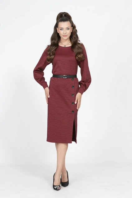 Платье п/пр силуэта выполнено из плательно-костюмной ткани.Длинный втачной рукав по низу обработан манжетой,которая застегивается на петлю и пуговицу.Перед платья с нагрудными вытачками.По юбке платья ассиметрично обработана шлица,которая закреплена декоративными пуговицами.Спинка со средним швом и талиевыми вытачками.В среднем шве обработана потайная молния.В комплект входит декоративный пояс. длина 110 см 46 р- о.г 96 о.т 90 о.б.102 48 р -о.г 100 о.т.94 о.б 106 50 р .- о.г.100 о.т.94 о.б 110 52 р - 108 о.т. 102 о.б 114