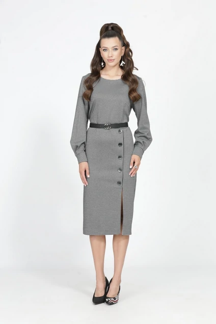 Платье п/пр силуэта выполнено из плательно-костюмной ткани.Длинный втачной рукав по низу обработан манжетой,которая застегивается на петлю и пуговицу.Перед платья с нагрудными вытачками.По юбке платья ассиметрично обработана шлица,которая закреплена декоративными пуговицами.Спинка со средним швом и талиевыми вытачками.В среднем шве обработана потайная молния.В комплект входит декоративный пояс. длина 110 см 46 р- о.г 96 о.т 90 о.б.102 48 р -о.г 100 о.т.94 о.б 106 50 р .- о.г.100 о.т.94 о.б 110 52 р - 108 о.т. 102 о.б 114