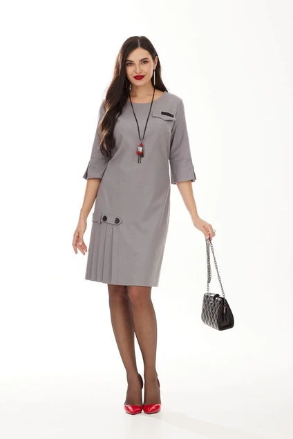 Платье прямого силуэта, выполненное из поливискозы. Перед платья с нагрудными вытачками и клапаном с декоративной нашивкой в области груди. В нижней правой части переда платья в подрез вставлена деталь, с заутюженными складками, сверху которой расположена пата с декоративными пуговицами. Спинка платья с талиевыми вытачками и со средним швом, в который вставлена потайная молния. Рукав втачной, длиной 3/4, в локтевой части по низу рукава также деталь со складками и декоративными пуговицами.