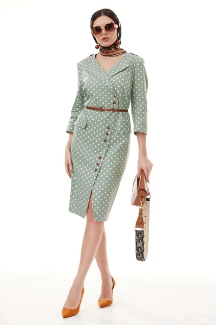 Перед платья с нагрудными вытачками и клапанами в области бёдер. Застежка асимметричная, двубортная, по низу платье расходится на разрез. В области плеч — погоны закрепляющиеся на пуговицу. Спинка с талиевыми выточками и средним швом, в низу которого обработана шлица. Рукава двухшовные втачные, длиной 3/4, с притачной манжетой. Платье с плечевыми накладками и со съёмным контрастным ремнем в цвет фурнитуры.