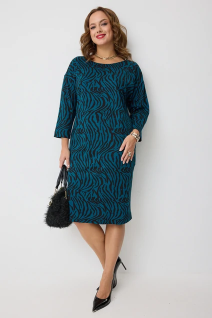 Платье полуприлегающего силуэта, длиной миди, со спущенной линией плеч, выполненное из поливискозного трикотажного полотна с анималистичным принтом. Перед с нагрудными вытачками и круглой формой горловины. Спинка с центральной складкой, имитирующей планку, с декоративными пуговицами. В верхней части спинки платья - декоративная вставка V-образной формы из двойной сетки. Рукав втачной одношовный длиной 3/4.