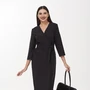 Платье прилегающего силуэта, длиной миди, выполненное из плательной поливискозы. Платье жакетного типа с ассиметричным передом. Одна из сторон переда имитирует жакет и юбку, другая-платье. Перед с талиевыми вытачками с подрезом. В области груди настрочена декоративная листочка, в области бедер - карманы-обманки с листочками и клапаном. По переду обработан разрез. В области талии расположена застёжка на 2 петли и крупные декоративные пуговицы. Спинка со средним швом, в который вставлена потайная молния. Рукав 2-х шовный втачной, длиной 3/4.