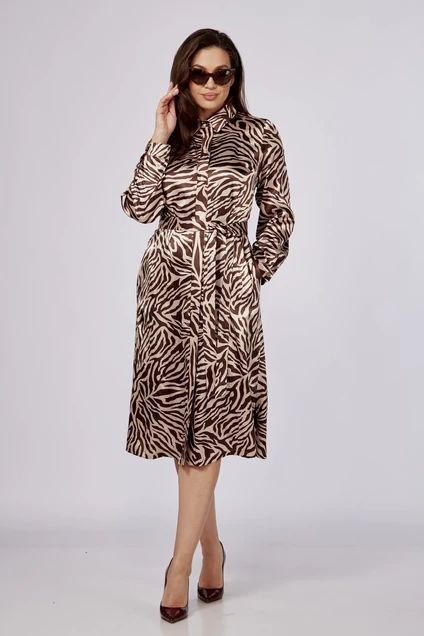 Платье А-образного силуэта под пояс.Воротник рубашечного типа, планка с потайной застёжкой на петли пуговицы. В боковых швах карманы и разрезы по низу изделия.Длинный рукав на манжете. В комплекте пояс из основной ткани Изделие на вискозной подкладке