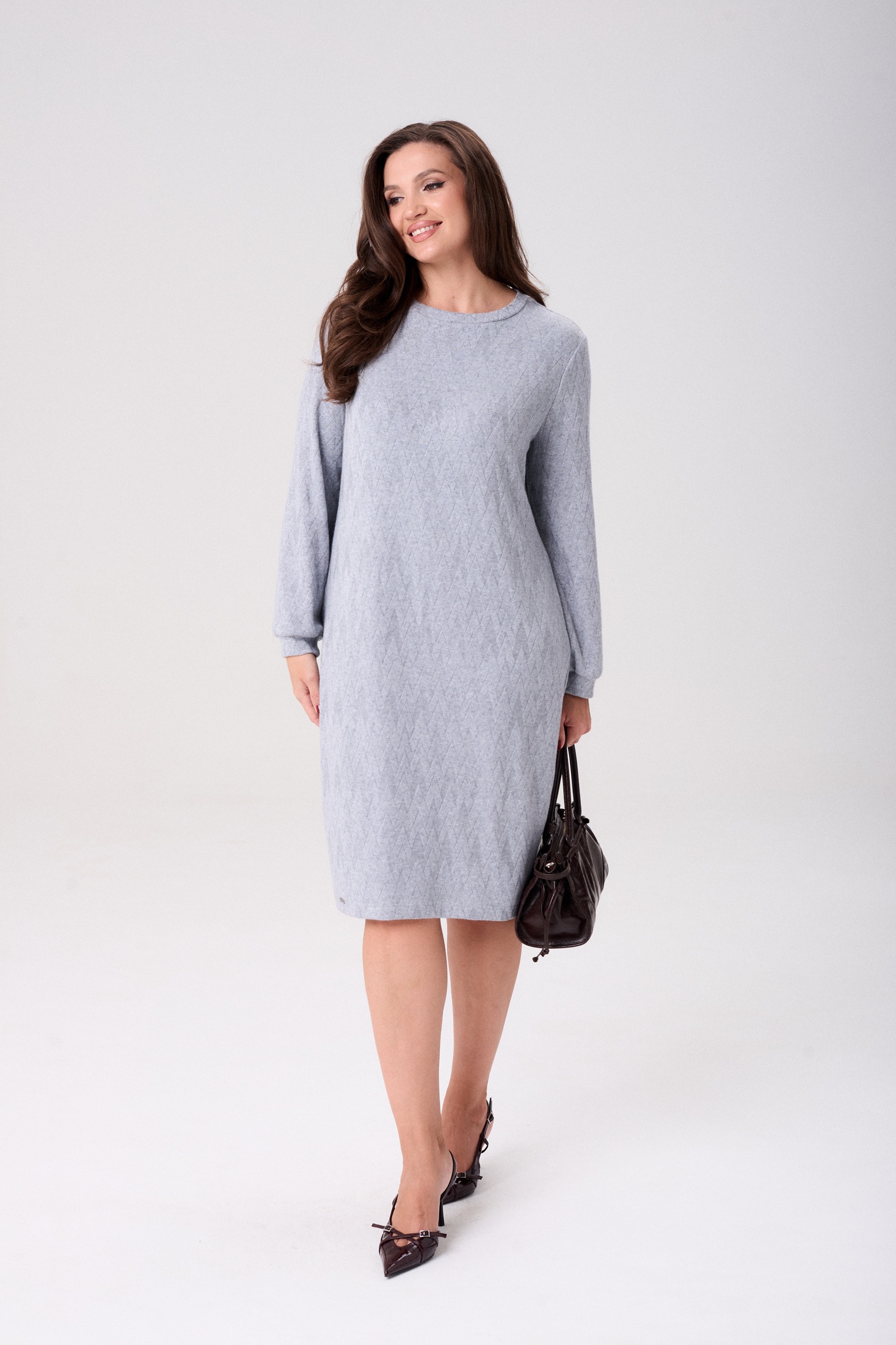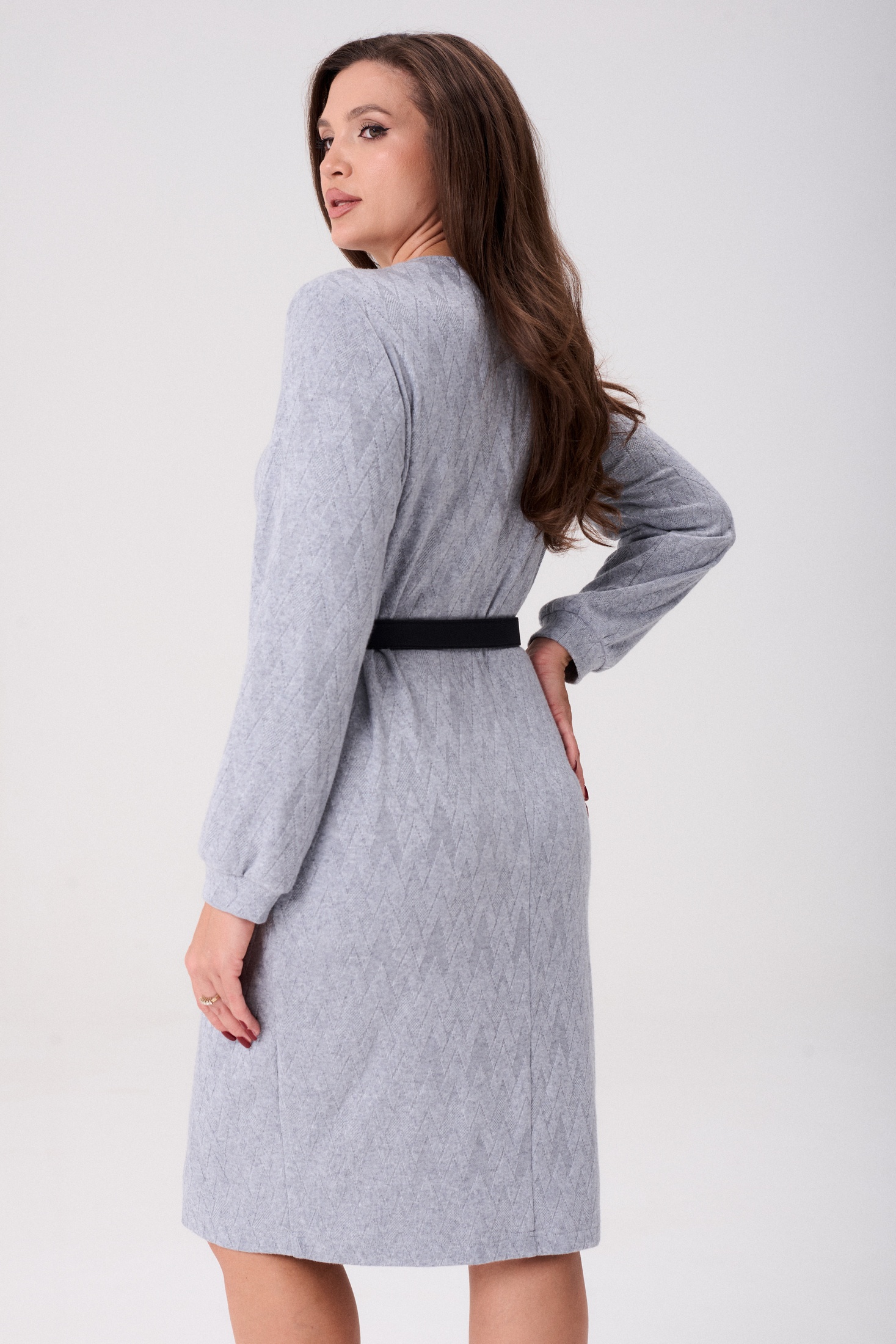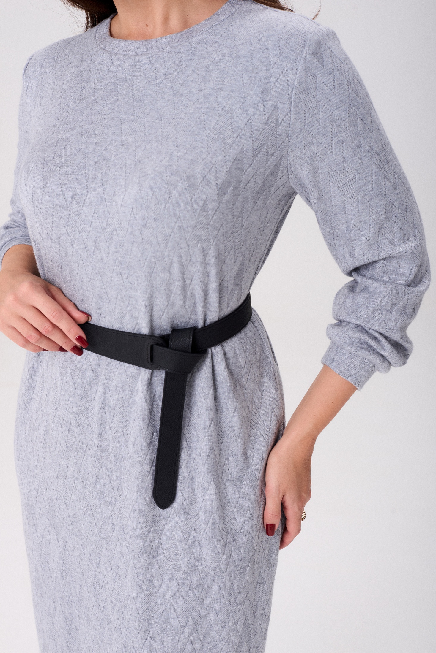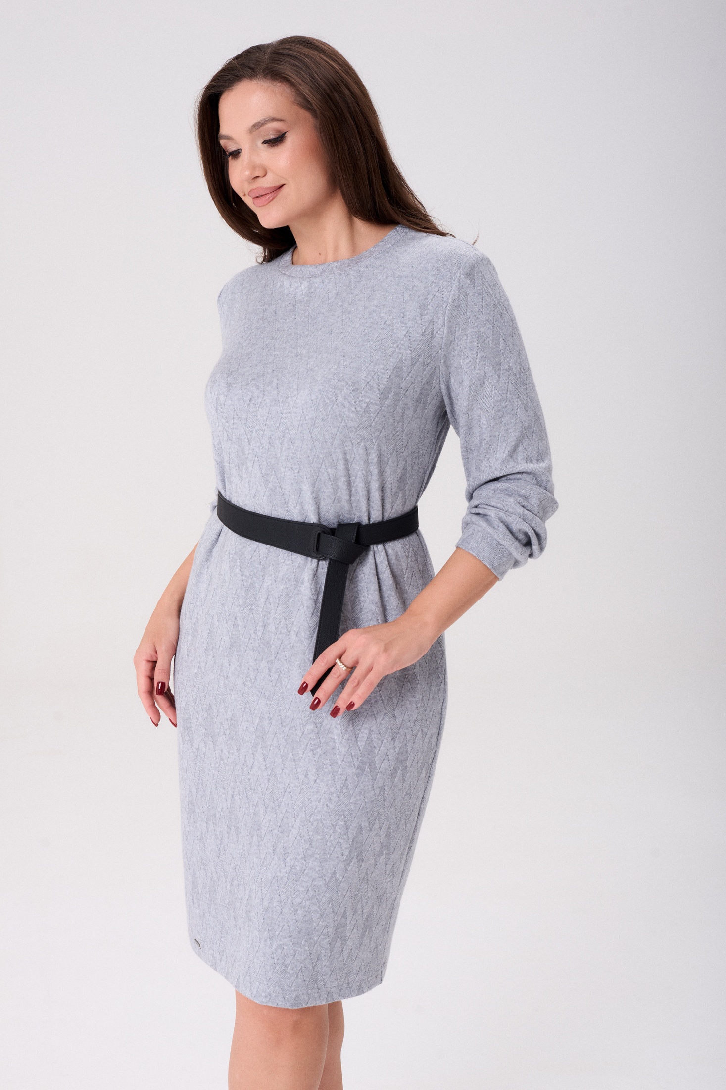 Трикотажное платье свободного силуэта с втачным рукавом с манжетой по низу. Вырез горловины круглый. Спинка со средним швом с застежкой на потайную молнию. В комплекте пояс из экокожи.