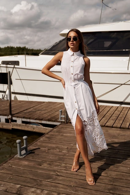 Летнее хлопковое платье без рукавов. Застежка на петли и пуговицы. Воротник рубашечный. Низ платья ажурный. Платье отрезное по талии. Юбка со складками. В комплекте съемный пояс-завязка. Юбка на подкладке.