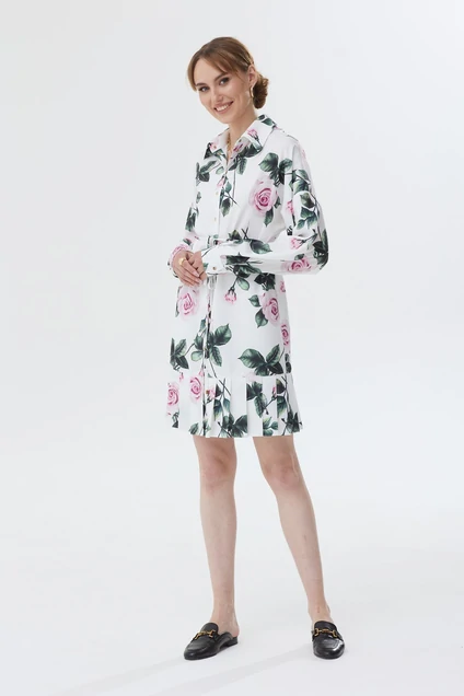 Платье свободного кроя. Длина мини. Застежка по переду на кнопки. Рукава свободные, низ на манжете с застежкой на кнопку. Воротник рубашечный. По низу платья складки. От талии платье на хлопковой