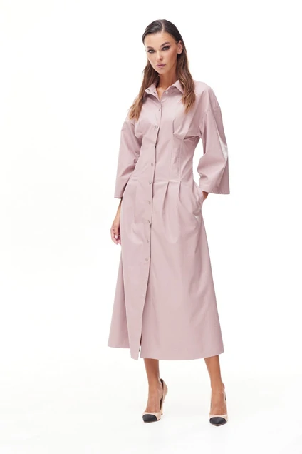 Платье из «эко» кожи полуприлегающего силуэта. Длина миди. Застежка по переду на кнопки. Воротник рубашечный. Рукав широкий, длина 3/4. В боковых швах карманы. Рукав 60 см. (от горловины).