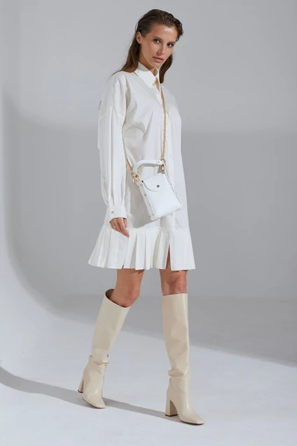 Платье-рубашка прямого силуэта, выполнена из хлопковой ткани. Застежка по переду на петли и пуговицы. Воротник рубашечный. Рукава длинные, низ на манжете. Манжета с застежкой на кнопку. По низу изделия отделка