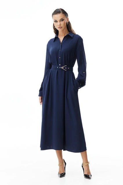Платье свободной формы из струящейся ткани. Длина миди. Воротник рубашечный. Застежка по переду на кнопки. Длина застежки до талии. По спинке кокетка. В боковых швах карманы. Рукава длинные с манжетой по