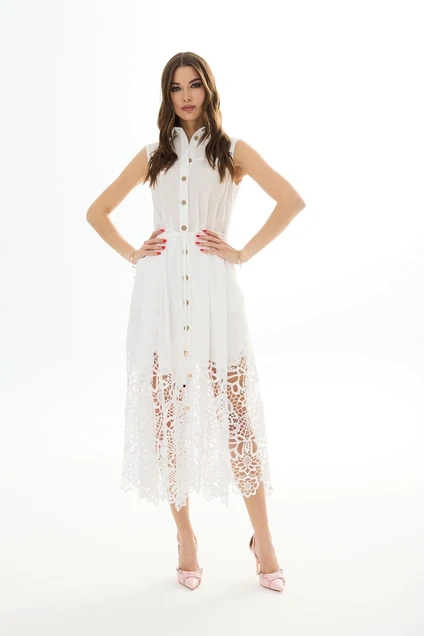 Летнее хлопковое платье без рукавов. Застежка на петли и пуговицы. Воротник рубашечный. Низ платья ажурный. Платье отрезное по талии, юбка со складками и карманами в боковых швах. В комплекте съемный пояс-завязка.Платье на подкладке.