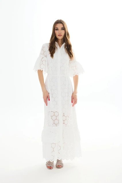 Платье из хлопковой ткани «шитье». Длина макси. По низу платья присборенные воланы. Отрезное по талии, по верхней и нижней части заложены складки. Застежка по переду на петли и пуговицы. Воротник рубашечный.