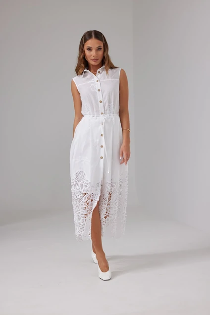 и пуговицы. Воротник рубашечный. Низ платья ажурный. Платье отрезное по талии,