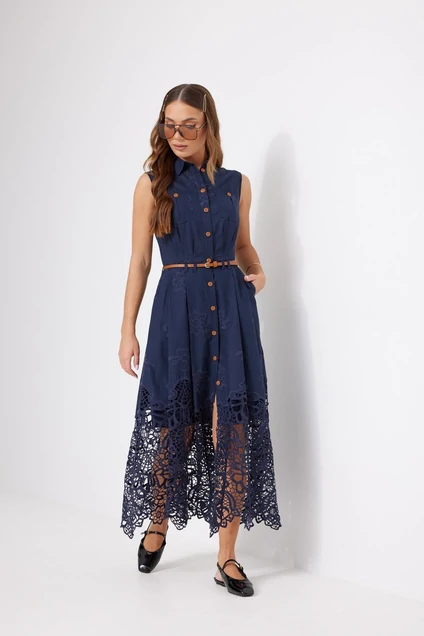 и пуговицы. Воротник рубашечный. Низ платья ажурный. Платье отрезное по талии,