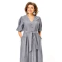 Платье женское расклешённого силуэта отрезное по талии. Отрезной пояс платья собран на резинку "венгерка" для прилегания по линии талии. Горловина переда V-образная. Рукава цельнокроеные с кулисой и вставленной в нее резинкой. Имеется навесной пояс из основной ткани. В боковых швах имеются карманы.