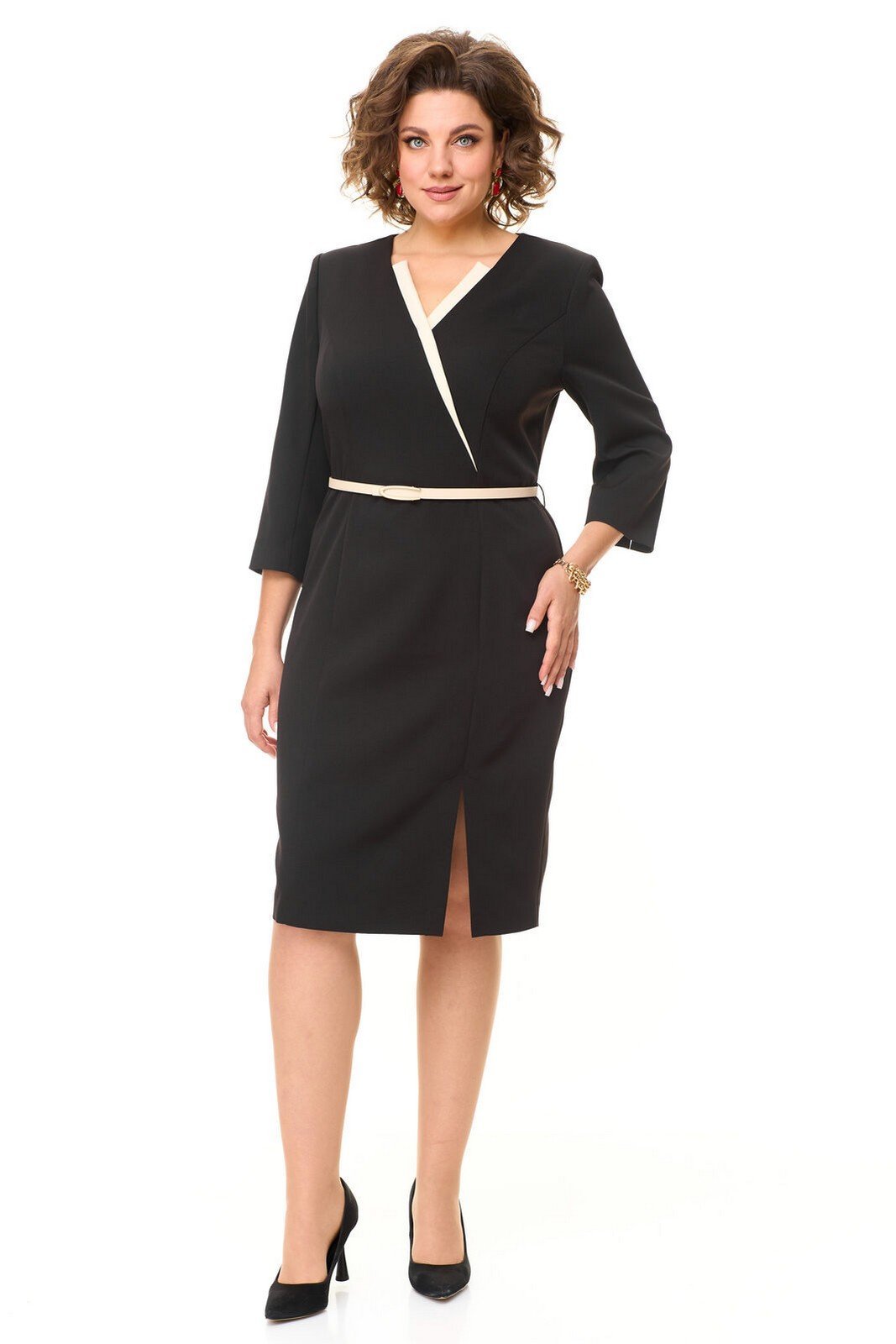 Платье женское полуприлегающего силуэта с естественной линией плеча. Рукав 3/4 втачной двухшовный с разрезом в локтевом шве. Горловина V-образной формы с контрастными планками. По переду выполнены полурельефы выходящие из пройм. Спинка с вытачками. В среднем шве спинки застежка на потайную тесьму-молнию и шлица. Имеется отделочный навесной пояс.