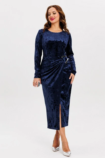 Платье женское из велюра. Платье женское полуприлегающего силуэта, заужено к низу.Рукав длинный, втачной, одношовный. Горловина округлой формы. Перед ассиметричный с запахом, драпировкой и декоративной пряжкой. Передние полотнища при ходьбе распахиваются и образуют разрез. Спинка со средним швом, талиевыми вытачками и застежкой на тесьму-молнию. Горловина обработана бейкой из подкладочной ткани 100% хлопка.
