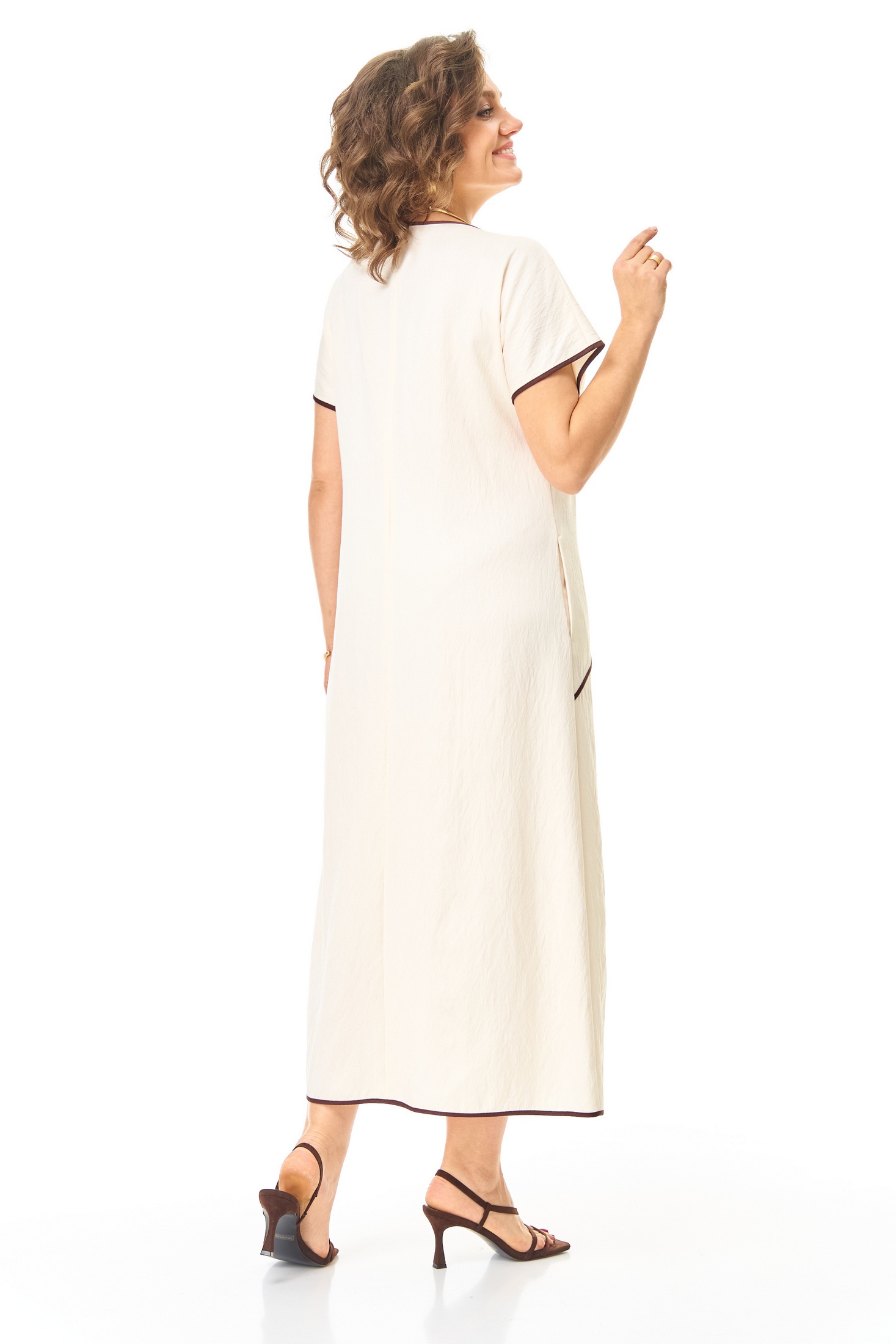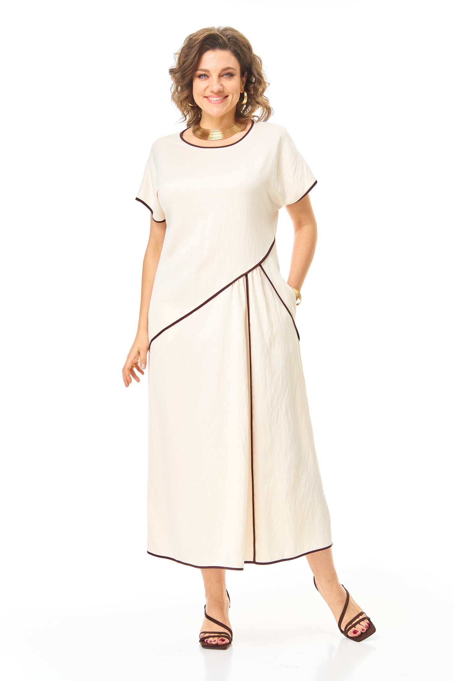 Платье 1260 молоко VI ORO — воплощение современного стиля для повседневного гардероба. Коллекция бренда VI ORO сочетает в себе утонченность и комфорт. Платье выполнено из мягкой вискозы с добавлением нейлона, что придает материалу легкость и воздухопроницаемость. Полуприлегающий силуэт, расширяющийся к низу, создает элегантный образ, а спущенные плечи и рукав типа 'летучая мышь' добавляют динамики. Практичные карманы и застежка на молнию обеспечивают удобство в носке. Горловина V-образной формы и контрастная отделка подчеркнуты изысканными линиями. Подходит для весны и осени, идеален для повседневных и деловых встреч. Цвет молочный, длина миди.